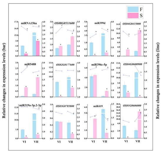 In the present study, the functional analysis of the identified target genes revealed that miR156a was downregulated in PA64S(S), and the target SPL16 gene (OS08g0531600) was upregulated. Scholars have found that low expression levels of miR156 in sterile plants may affect anther formation during pollen development, and this conclusion is consistent with our findings [72]. Furthermore, an elevated ambient temperature also was found to cause increased miR156 expressions and the downregulation of miR156-targeted SPL [73], the results indicating that the ambient temperature is also an input signal for miR156-regulated pathways. Clearly, this result was contrary to our study, suggesting that the downregulation of miR156 may be in response to changes in fertility rather than in response to changes in temperature. In our past study, we found that the GA content differed significantly under different fertility conditions. The GA content was significantly higher in PA64S(F) than in PA64S(S) in the later stages of spike development, and the same trend was observed for the positive GA effector GAMYB. The promotion of flowering by GA in Arabidopsis was demonstrated to involve an interaction between DELLA proteins and SPLs, and several DELLA proteins interact and repress SPL protein activities [74]. We conjecture that GA may play a regulatory role between DELLA and SPL, participating with miR156 in regulating changes in SPLs. Therefore, we speculate that the significantly differentially expressed miR156a and its target genes identified in PA64S are involved in its fertility regulation process. In the subsequent qPCR verification (Figure 9), the expression pattern of miRNA—target gene pairs was also found to conform to our results.