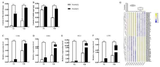 The content of metabolites and relative expression of related genes involved in the regulation of male fertility processes. (A) Content of flavonoid, (B) content of soluble sugar, (C) relative expression level of C4Ht, (D) relative expression level of CHS1, (E) relative expression level of 4CL, (F) relative expression level of LTP2, and (G) phospholipid content of phospholipid and different lipid groups in PA64S(S) and PA64S(F) lipid metabolism. The box plot indicates the total content of phospholipids. CL: cardiolipin; DLCL: di-lyso cardiolipin; MLCL: mono-lyso cardiolipin; PA: phosphatidic acid; PC: phosphatidylcholine; PE: phosphatidylethanolamine; PG: phosphatidylglycerol; PI: phosphatidylinositol; PIP2: phosphatidylinositol diphosphate; and PS: phosphatidylserine. Asterisks indicate significant differences revealed by Student’s t-test at p < 0.01 (**).