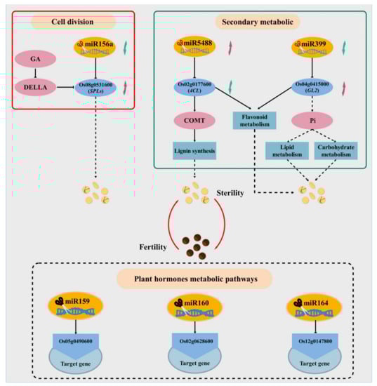 Many researchers have used high-throughput sequencing technology to screen a large number of potential miRNAs related to plant fertility changes. These miRNAs participate in important regulatory processes such as plant ovule development, flower bud differentiation, and anther development [62,63,64]. However, there have been few reports on the study of miRNAs involved in PTGMS rice fertility regulation. Plant genomics studies have shown that many miRNAs and their target genes are involved in the coordination of flower differentiation and development, and most miRNAs negatively regulate certain genes in plant development by cutting or inhibiting the translation of target transcripts [65]. Therefore, the accurate identification of differential miRNA and functional target gene expression during fertility development has become an effective way to find and regulate fertility genes.
