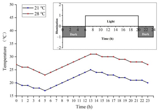 Temperature setting conditions for the low- and high-temperature treatment of PA64S. The red line represents the high-temperature treatment, and the blue line represents the low-temperature treatment. In the light intensity diagram, dark rectangles represent darkness, and light rectangles represent lights.