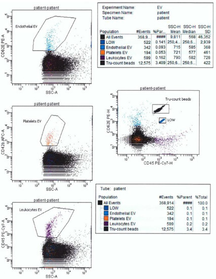 In cytometry, in addition to establishing the presence of EVs in the biological material, their origin can be determined, depending on the expression of EV antigens. This is possible thanks to the use of monoclonal antibodies [2]. Figure 2 presents the simplest analysis of EVs originating from endothelial cells, platelet and leukocytes in patient plasma using the following antibodies: anti-CD62E PE (for endothelial EVs), anti-CD42b APC (for platelet EVs), and anti-CD45 PE-Cy7 (for leukocyte EVs) [57,58,59].