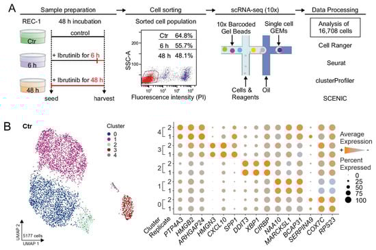 The single-cell RNA sequencing experiment was performed across two independent biological replicates including a control of untreated REC-1 cells (Ctr) and REC-1 treated with 400 nM ibrutinib for 6 h and 48 h. Side-by-side viability assays ensured the previously shown cell death of REC-1 cells after ibrutinib treatment (data not shown) []. Cell sorting, sequencing, and quality control left a total number of 16708 cells for analysis (Figure 1A, Table S1).