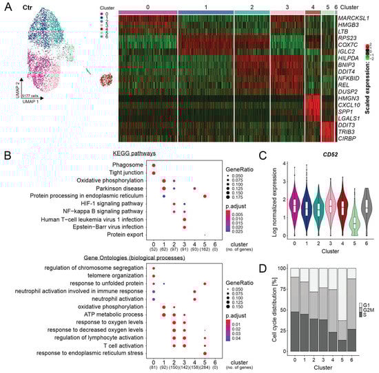 Heterogeneity of REC-1 cell line on the single-cell level. (A) Uniform manifold approximation and projection (UMAP) representation visualizing 7 clusters at resolution 0.4 in the integrated and cell cycle regressed data set of untreated cells (Ctr) and the corresponding heatmap showing selected top 10 marker genes (see Table S2 for cluster markers); (B) gene set enrichment analysis for Kyoto Encyclopedia of Genes and Genomes (KEGG) pathways and gene ontologies (biological processes) including genes of Ctr with a log fold change > 0.1 and adjusted p-value < 0.001 (no. = number); no matches were detected for cluster 6 due to few differentially expressed genes (DEGs); (C) violin plot of CD52 expression in Ctr (clustering is shown in (A); and (D) bar plot showing the proportions of predicted cell cycle phases (G1, G2/M, or S) across clusters of Ctr by Seurat’s cell cycle scoring.