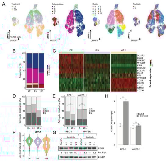 Evolution of subpopulations across ibrutinib treatment. (A) Uniform manifold approximation and projection (UMAP) representations of the combined data set including replicate 1 and 2 of Ctr, 6 h, and 48 h after cell cycle regression (clusters are shown for resolution 0.4 with additional subclustering of subpopulation D at resolution 0.3); (B) proportions of subpopulations across treatment; (C) heatmap of selected marker genes of Ctr, 6 h, and 48 h (see Table S3 for treatment markers); (D) distribution of predicted cell cycle phases (G1, G2/M, and S) across treatment by Seurat’s cell cycle scoring; (E) distribution of cell cycle phases acquired by flow cytometry (sensitive REC-1 compared to resistant MAVER-1 cell line, D = DMSO control, 48 h = 48 h 400 nM ibrutinib treatment; n = 3, * p ≤ 0.05, ns = not significant); (F) violin plot of LDHA expression levels of the single-cell sequencing data; (G) Western blot of LDHA expression after ibrutinib treatment (DMSO as control, 400 nM ibrutinib for 2 d, 3 d, and 4 d) in sensitive REC-1 and in resistant MAVER-1, β-actin served as loading control, relative expression (Rel. Expr.) to DMSO control was calculated after normalization to β-actin (Western blot and relative expression values are shown representative for three independent replicates); and (H) extracellular flux analysis of 3 d ibrutinib (400 nM) or DMSO (control) treated cells (sensitive REC-1 compared to resistant MAVER-1) by Agilent Seahorse XF 96 Analyzer; the ratio of oxygen consumption rate (OCR) to extracellular acidification rate (ECAR) is shown (n = 3, ** p ≤ 0.005, ns = not significant).