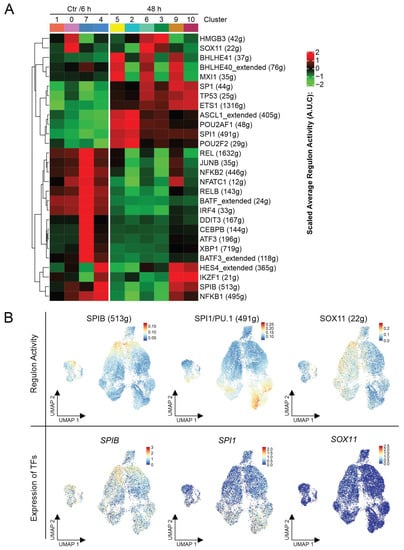 Altered gene regulatory networks during ibrutinib treatment. (A) Heatmap representing the alterations in gene regulatory networks in the eleven clusters of the combined analysis (Ctr, 6 h, and 48 h) (clustering is shown in Figure 3A), numbers in brackets indicate the amount of genes forming the gene regulatory networks of the indicated transcription factor and (B) uniform manifold approximation and projection (UMAP) representations in the first row show the regulon activity of the indicated transcription factors, UMAPs underneath display the gene expression (log normalized) of the transcription factors.