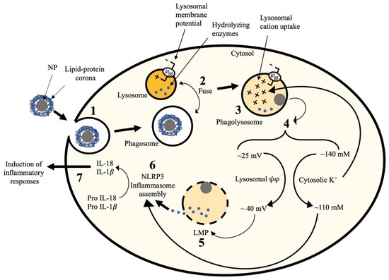 - Jessop, F.; Hamilton, R.F., Jr.; Rhoderick, J.F.; Fletcher, P.; Holian, A. Phagolysosome acidification is required for silica and engineered nanoparticle-induced lysosome membrane permeabilization and resultant NLRP3 inflammasome activity. Toxicol. Appl. Pharm. 2017, 318, 58–68. [Google Scholar] [CrossRef]