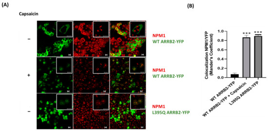 We previously reported that the activation of TRPV1 induced the translocation of ARRB2 into sub-nuclear structures that resembled nucleoli [11]. To determine whether ARRB2 was localized to the nucleolus, we conducted immunostaining for nucleophosmin (NPM1), an abundant nucleolar protein marker that binds single-stranded and double-stranded nucleic acids and is associated with ribonucleoprotein structures. NPM1 has been shown to regulate ribosome biogenesis, mRNA processing, chromatin remodeling, and embryogenesis [17]. In HEK293 cells transfected with TRPV1 and WT Yellow Fluorescent Protein (YFP)-tagged ARRB2, capsaicin induced the trafficking of ARRB2 in NPM1 immunopositive nucleoli (Figure 1A), as denoted by an increase in the degree of colocalization between ARRB2 and NPM1 in response to capsaicin (Figure 1B). To rule out any artefact effect of capsaicin and test the intrinsic property of ARRB2 to localize in the nucleolus, we used a mutant of ARRB2 defective of its nuclear export signal (NES), by replacing the Leucine-395 of ARRB2 with a glutamine residue. In the absence of capsaicin stimulation, the ARRB2 L395Q mutant co-localized with NPM1 in the nucleolus (Figure 1A,B), suggesting that TRPV1-mediated post-translational regulation impacts the nuclear export function of ARRB2.