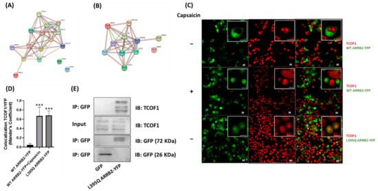 To further identify the protein–protein interaction networks of ARRB2 and to gain insight into the cellular processes implicated, we used STRING v11 database analysis (https://string-db.org/) (accessed on 14 June 2019). Having demonstrated that ARRB2 translocated to the nucleolus following TRPV1 activation, and given that the nucleolus is a dynamic boundless structure where rRNA transcription, pre-rRNA processing and the assembly of ribosome subunits take place [18], we screened for ARRB2-interacting proteins involved in ribosomal biogenesis. Using the STRING analysis, we identified TCOF1, nucleolar and coiled-body phosphoprotein (NOLC1), upstream binding transcription factor (UBTF), nucleolar protein 56 (NOP56), NPM1, fibrillarin (FBL) and H/ACA ribonucleoprotein complex subunit DKC1 (DKC1) which are all related to ribosomal biogenesis and mRNA translation (Figure 3B). TCOF1 and NOLC1 associate with each other and serve as a platform to link POL I with enzymes responsible for ribosomal synthesis and modification [19]. UBTF, on the other hand, activates the transcription of rRNA by POL I [20], while NPM1 is involved in ribosome assembly [21] and in promoting the cleavage and the maturation of pre-rRNA [22]. TCOF1, along with NOLC1 and UBTF, was the most abundant protein identified in our proteomics experiment. We thus performed immunocytochemistry and co-immunoprecipitation to test the interaction between ARRB2 and TCOF1 in HEK293 cells transfected with TRPV1. As previously reported [23], TCOF1 was found in the nucleolus where it is known to be active. In the absence of capsaicin, WT ARRB2 was excluded from the nucleolus and did not colocalize with TCOF1 (Figure 3C,D). In contrast, following incubation with capsaicin, a high degree of colocalization between TCOF1 and ARRB2 or nucleus-sequestered L395Q ARRB2 mutant, was measured (Figure 3C,D). These results suggested that, when shuttled to the nucleolus, ARRB2 was able to interact with TCOF1. We then used co-immunoprecipitation to further confirm the interaction between ARRB2 and TCOF1. As the incubation of HEK293 cells with the protein lysis buffer alone was able to promote the translocation of WT ARRB2, we used the GFP plasmid as a negative control. As observed by immunostaining, ARRB2-TCOF1 interaction was confirmed biochemically following immunoprecipitation (Figure 3E).