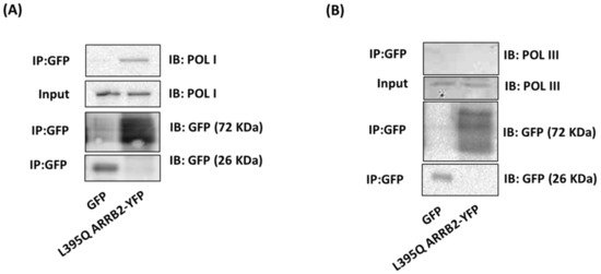 TCOF1 is involved in forming the machinery necessary for ribosomal RNA transcription, through its interaction with POL I and UBTF in the nucleolus [24]. The three RNA polymerases (I, II and III) contribute, in a coordinated manner, to the process of ribosome synthesis [25]. POL I transcribes 5.8S, 18S and 18S rRNAs that are constituents of the mature ribosomal subunits. After validating the interaction between ARRB2 and TCOF1, we tested whether POL I was part of the rRNA transcription complex. As performed in Figure 3, immunoprecipitation experiments using L395Q ARRB2-YFP or GFP control identified RNA POL I in complex with the nucleus-enriched L395Q ARRB2 (Figure 4A), indicating an interaction between ARRB2 and POL I in the nucleus. However, RNA polymerase III (POL III), another polymerase that is involved in rRNA transcription, was not found to be part of the ARRB2 signaling complex (Figure 4B).