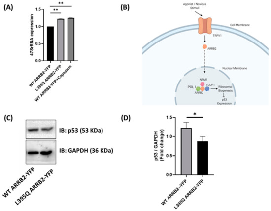 The tumor suppressor p53 is a nuclear transcription factor that promotes cell-cycle arrest in response to DNA damage or other cellular stressors [26]. TCOF1, through its role in ribosomal biogenesis, has been shown to inhibit the expression of p53 and its downstream genes—Pmaip1, Ccng1, Trp53inp1, Perp and Wig1 [27]. A reduction in p53 levels was shown to be associated with an upregulation of rRNA synthesis and ribosomal biogenesis, in response to cytotoxic stress. Donati et al. found that a decreased availability of ribosomal proteins for the E3 ubiquitin-protein ligase Mdm2 led to an increase in MDM2-mediated degradation of p53 [14]. In addition to its well known pro-apoptotic effects, p53 has been shown to promote neuronal differentiation [16], including neuronal outgrowth and branching, which are processes that are associated with changes in neuronal excitability that contributes to the development of chronic pain [28]. We thus assessed the influence of ARRB2 shuttling on rRNA synthesis and p53 levels. Expression of 47S pre-rRNA—the precursor for mature rRNAs 18S, 5.8S, and 28S—was enhanced in neuro2a cells transfected with the L395Q ARRB2-YFP mutant, or after capsaicin activation of TRPV1 (Figure 5A). As p53 is regulated by ribosomal biogenesis (Figure 5B), we next sought to examine whether ARRB2-induced increase in rRNA synthesis could alter p53 level and neurite outgrowth.