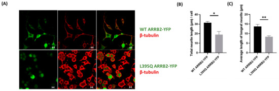 ARRB2 nuclear localization decreased neurite outgrowth in neuro2a cells. (A) Representative confocal images of neuro2a cells transfected with WT ARRB2-YFP or L395Q ARRB2-YFP. Neurite branching and length were determined using ß-tubulin immunostaining and quantification by ImageJ (B,C). Scale bars, 10 μm. * p < 0.05; ** p < 0.01 by Mann–Whitney U test. N = 30 images analyzed from three independent experiments.