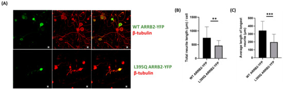 Following the observation that ARRB2 nuclear localization caused a decrease in p53 expression, we sought to examine the effect of ARRB2-induced p53 suppression on neurite outgrowth. Neuro2a cells were transfected with either WT or L395Q ARRB2-YFP. As observed in the transfected HEK293 cells, the L395Q ARRB2 mutant was sequestered in the cell nucleus compared to WT ARRB2 (Figure 6A). To induce differentiation, neuro2a cells were serum-starved for 24 h post-transfection, before β-tubulin immunostaining. As shown in Figure 6A, serum starvation promoted mitotic arrest and the extension of several neurites per cell. Analysis of the neurite outgrowth and branching revealed that nuclear accumulation of the L395Q ARRB2 mutant induced an overall decrease in neurite growth and the average length of the longest neurite/cell, compared to WT ARRB2-YFP (Figure 6B,C).