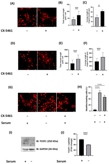To investigate the link between ribosomal biogenesis and neurite outgrowth, we used the CX-5461 compound, a highly selective inhibitor of POL I transcription [29]. At 100 nM, CX-5461 induced a significant increase in neurite outgrowth in both differentiated neuro2a cells (Figure 8A–C) and cultured DRG neurons (Figure 8D–F) 24 h post-treatment. Notably, CX-5461 alone could induce neurite outgrowth in neuro2a, regardless of the presence of serum (Figure 8G,H), suggesting that the inhibition of ribosomal biogenesis is sufficient to promote neuronal differentiation and neurite outgrowth. Furthermore, following serum starvation, differentiated neuro2a cells exhibiting neurite extension expressed less TCOF1 protein, compared to undifferentiated cells (Figure 8I,J). These data demonstrate that inhibition of ribosomal biogenesis promotes neurite outgrowth, and identified that the ARRB2-interacting protein, TCOF1, exerts a putative inhibitory role on neuronal differentiation.