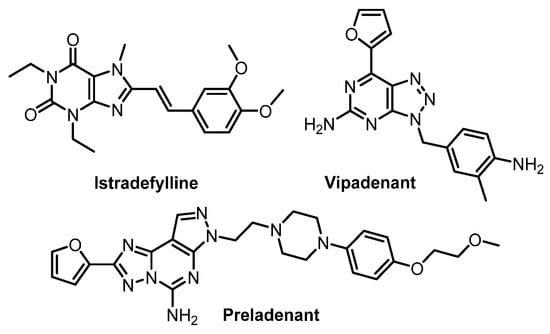 - Pinna, A. Adenosine A2A receptor antagonists in Parkinson’s disease: Progress in clinical trials from the newly approved istradefylline to drugs in early development and those already discontinued. CNS Drugs 2014, 28, 455–474. [Google Scholar] [CrossRef]