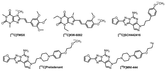 Five radiotracers for PET imaging of the A2AR, namely [11C]TMSX, [11C]preladenant, [11C]SCH442416, [11C]KW-6002 and [18F]MNI-444, have been evaluated in humans (Figure 2) []. Among those, [11C]SCH442416 is the only radiotracer investigated in PD patients with L-DOPA-induced dyskinesia despite suffering from high levels of background non-specific binding []. Furthermore, fluorine-18 is the most predominant radionuclide for PET imaging due to its attractive half-life (109.7 min) that allows multistep synthesis and distribution to various PET centers after production, and its lower positron energy (635 keV) facilitating high image resolution. Thus, an 18F-labeled radiotracer, namely [18F]MNI-444, was developed for clinical application. Although [18F]MNI-444 presents an excellent ratio of specific-to-non-specific binding in healthy subjects, the relative slow kinetics of this radiotracer may limit its routine clinical use due to too-long scan times needed [].