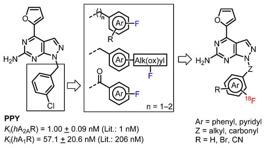 Aiming to develop a new A2AR radiotracer presenting the advantages of fluorine-18, a high specific binding and suitable pharmacokinetic for clinical use, we selected PPY (Figure 3) [,], an analog of the extensively studied A2AR antagonist vipadenant (Figure 1), as lead compound due to its high A2AR binding affinity of 1 nM and 260-fold selectivity over the A1R subtype. Furthermore, it possesses all favorable physicochemical and absorption, distribution, metabolism, and excretion (ADME) properties for a CNS PET radiotracer, e.g., M = 326 g/mol, cLogD7.4 = 4.01, polar surface area = 83 Å2 and H-bond donors = 2 []. The 4-(furan-2-yl)pyrazolo-[3,4-d]pyrimidine building block was used as starting point for further investigations. Fluorinated derivatives have been synthesized by varying the substituents at the N1 position of the pyrazole. Hence, the lead compound was modified by replacing the benzyl moiety by various substituted fluorobenzyl, fluorobenzoyl or fluoropyridyl groups and linker extensions to study the impact on the binding affinity towards the A2AR (Figure 2). Thus, a series of 20 novel A2AR ligands bearing the fluorine atom either at aromatic or aliphatic positions was developed. The ligands with the highest binding affinity and off-target selectivity were selected for the development of 18F-labeled ligands by radiofluorination of the corresponding precursors and for preliminary biological investigations of the novel potential A2AR radiotracers.