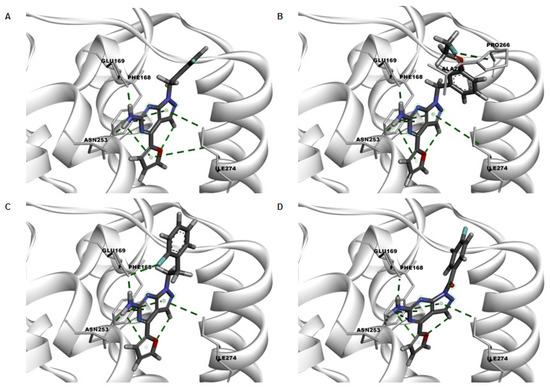 Key interactions in green dotted lines of the docking poses of representative active compounds (A) PPY2, (B) PPY17, (C) PPY19 and (D) PPY21 in the binding site of crystal structure of A2AR (PDB ID: 4EIY).