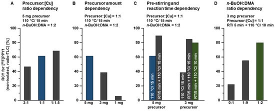 Investigated reaction conditions for the radiosynthesis of [18F]PPY1: (A) ratio of precursor 6-to-copper catalyst, (B) amount of precursor 6 and (C) with/without pre-stirring of [18F]TBAF with [Cu] for 5 min at RT and reaction time dependency, (D) ratio of n-BuOH-to-DMA.