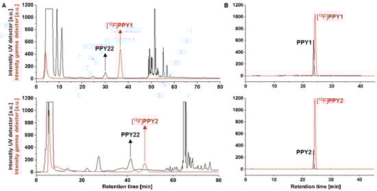 (A) Representative radio- and UV-chromatograms obtained for isolation of [18F]PPY1 [ReproSil-GOLD 120 C18 column (250 × 10 mm), 34% MeCN/H2O, flow rate: 4 mL/min] and [18F]PPY2 [ReproSil-Pur 120 C18-AQ column (250 × 10 mm), 30% MeCN/H2O, flow rate: 5 mL/min] by semi-preparative RP-HPLC (PPY22 = by-product); (B) radio- and UV-chromatograms of formulated [18F]PPY1 and [18F]PPY2 co-injected with the corresponding reference compound PPY1 or PPY2 [ReproSil-GOLD 120 C18 column (250 × 4.6 mm), 10–90–10% MeCN/H2O, flow rate: 1 mL/min].