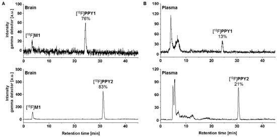 In vivo metabolism study in CD-1 mice: Representative radio-chromatograms of extracted (A) brain and (B) plasma samples at 30 min p.i. of [18F]PPY1 [ReproSil-GOLD 120 C18 column (250 × 4.6 mm, 5 µm), 10-90-10% MeCN/H2O, flow rate: 1 mL/min] and [18F]PPY2 [ReproSil-Pur 120 C18-AQ column (250 × 4.6 mm, 5 µm) 10–90–10% MeCN/H2O, flow rate: 1 mL/min].