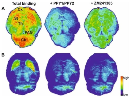 Representative autoradiographic images of the transversal plane of mouse brain slices representing total binding of (A) [18F]PPY1 and (B) [18F]PPY2. Non-specific binding is depicted in the presence of either 1 µM PPY1, PPY2 or ZM241385. Abbreviations: Cb—cerebellum; Cx—cortex; PAG—periaqueductal gray; St—striatum; Th—thalamus.