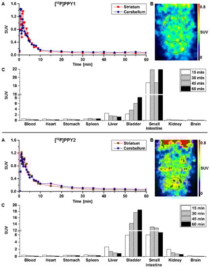 Stability of [18F]PPY1 and [18F]PPY2 was proven in all tested media (saline, PBS and n-octanol) at 37 °C up to 60 min. The distribution coefficient (LogD7.4) in the n-octanol-PBS system was experimentally determined by the shake-flask method. Observing LogD7.4 values of 1.59 ± 0.15 (n = 3) and 2.01 ± 0.16 (n = 3) for [18F]PPY1 and [18F]PPY2, respectively, we assume that a significant passive diffusion through the BBB can be expected for both radiotracers [,,].