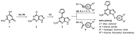 The synthesis of the novel fluorinated derivatives has been performed as described for PPY [,] with minor modifications. First, commercially available pyrimidine 1 is formylated via a Vilsmeier–Haack reaction. Then, an electrophilic aromatic substitution led to an iminium ion, which was hydrolyzed during workup to the corresponding aldehyde. After cyclization with hydrazine and purification by recrystallization from N,N-dimethylformamide (DMF)/water, compound 2 was isolated with 70% yield over two steps. In the literature, the pyrazolo[3,4-d]pyrimidine 3 was obtained by protection of the amine in 2 with a tert-butoxycarbonyl (Boc) group, followed by Stille coupling with 2-(tributyl-stannyl)furan in the presence of bis(triphenylphosphine)-palladium(II) and, finally, thermal Boc-group removal using aqueous dimethylamine with an overall yield of 16% [,]. In our hands, the Stille coupling was optimized by using the unprotected compound 2 directly to give 3 with 82% yield. The key building block 3 was used for the development of all further derivatives described herein as shown in Scheme 1.
