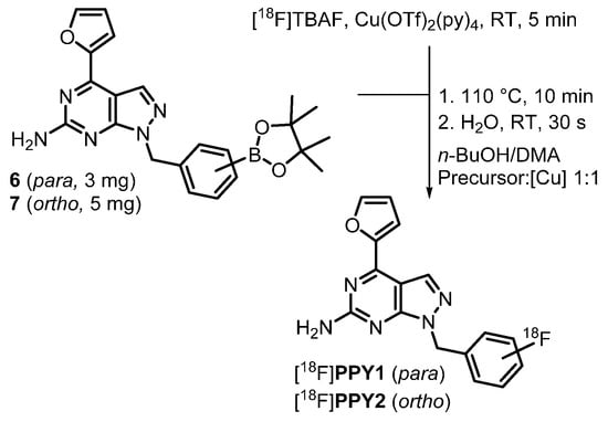 Radiosynthesis of [18F]PPY1 and [18F]PPY2 by an alcohol-enhanced copper-mediated radiofluorination of the corresponding boronic acid pinacol ester precursor 6 or 7.