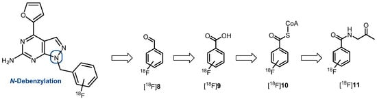 Radiometabolite analysis of [18F]PPY1 and [18F]PPY2 was performed for plasma and brain at 30 min after radiotracer injection into CD-1 mice (n = 2, respectively). Recovery efficiencies of extracted activity were 82–93% and 95–98%, for plasma and brain homogenates, respectively. A high amount of radiometabolites was detected in plasma with only 13% and 21% of total activity corresponding to intact [18F]PPY1 and [18F]PPY2 (Figure 7B). In brain samples, 76% and 83% of total activity represented intact [18F]PPY1 and [18F]PPY2 (Figure 7A). One major hydrophilic metabolite ([18F]M1, tR = 3 min) was detected in brain, which might be a result of N-debenzylation as previously reported in an in vivo study of vipadenant []. The possible pathway could be explained by the metabolic degradation of the 18F-bearing benzyl group and formation of [18F]fluorobenzaldehyde [18F]8, that is converted to [18F]fluorobenzoic acid [18F]9, which is then metabolized to [18F]fluorobenzoyl-CoA [18F]10 and [18F]fluorobenzoglycine [18F]11 (Scheme 3). It is known that [18F]9 and [18F]10 are able to cross the BBB and might limit the applicability of [18F]PPY1 and [18F]PPY2 for PET imaging and quantification of the A2AR in the brain.