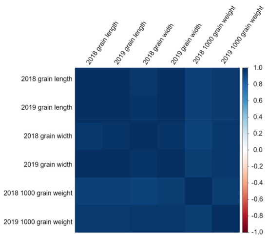 Correlation matrix heatmap with grain characteristics. The grain length, grain width, and 1000 grain weight all showed positive correlations. Therefore, grain shape is an important factor that can increase rice yield.