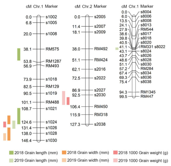 Chromosomal location of quantitative trait loci (QTLs) associated with grain size in the SNDH line. The QTLs mapped to chromosome 1, chromosome 2, and chromosome 8. Moreover, QTLs for all traits related to grain size were commonly located at s1024–s1026 on chromosome 1.