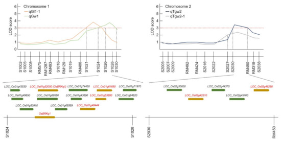 Quantitative trait locus (QTL) analysis and physical mapping related to grain-size candidate genes. After 2 years of QTL mapping, s1024–s1028 on chromosome 1 and s2030–RM450 on chromosome 2 were mapped consecutively. There were various candidate genes in this region, of which OsBRKq1 on chromosome 1 was screened as a grain-size-associated gene.