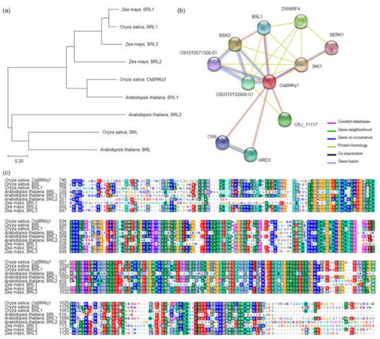 Sequence analysis of OsBRKq1. (a) Analysis of the relationships of the OsBRKq1 gene and analysis of a homologous gene, using a phylogenetic tree that was constructed using 1000 bootstrap replicates. (b) Various proteins interacted with OsBRKq1. Brassinosteroids (BRs) regulate the growth and development all of plants. BRs regulate various pathways, such as the development of grain size, ethylene biosynthesis, and proton secretion into the cell wall. All of these proteins are related to the BR biosynthesis pathway. (c) Conserved domain of the protein sequences of homologous genes of OsBRKq1; very high similarity was observed in Oryza sativa, Arabidopsis thaliana, and Zea mays.