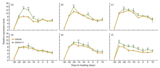 Analysis of the relative expression level of candidate genes related to grain size at the spikelet differentiation stage. Relative expression levels were analyzed at intervals of 5 days from 30 days before heading to 10 days after heading. The panicle formation stage starts from 30 days before heading, and grain size is determined at this time. The relative expression levels of candidate genes were analyzed in SNDH6 and SNDH117. * significant at the 0.05 level; ** significant at the 0.01 level. (a) OsBRKq1, (b) LOC_Os01g48444, (c) LOC_Os01g53880, (d) LOC_Os01g61690, (e) LOC_Os02g42310, and (f) LOC_Os02g46260.