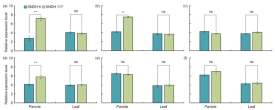 Comparison of relative gene expression levels in the leaves and panicles of the SNDH 6 and SNDH 117 lines, which had the smallest and largest grains, respectively, among the SNDH lines. There were no significant differences in any of the candidate genes in leaves. However, in the panicles, LOC_Os01g48444 and LOC_Os01g61690 were significantly different (p < 0.05) between the SNDH 6 and SNDH 117 lines. Moreover, LOC_Os01g52050 was significantly different (p < 0.01) between the SNDH 6 and SNDH 117 lines in the panicles. ns no significant; ** significant at the 0.01 level. (a) OsBRKq1, (b) LOC_Os01g48444, (c) LOC_Os01g53880, (d) LOC_Os01g61690, (e) LOC_Os02g42310, and (f) LOC_Os02g46260.