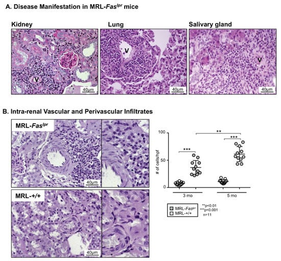 Dominant vascular manifestations on MRL-Faslpr lupus mouse model. (A) Histopathological imaging of vascular infiltration in the kidney, lung, and salivary glands in 5-month-old MRL-Faslpr mice. (B) Intra-renal evaluation of vascular and perivascular infiltrates in MRL-Faslpr mice (3 and 5 mo of age) compared to MRL-++ mice (control strain), n = 11 (a single data refers to a single animal). Representative microphotographs are shown (magnification 40×). Values are means ± SEM. Statistical analysis using Mann–Whitney U Test. v, vascular lumen