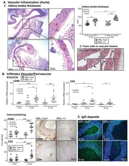 Marked increase in intima–media thickness of aorta and infiltration of vessel wall with macrophages and T cells in MRL-Faslpr mice. (A1). Intima-media thickness of the aorta in MRL-Faslpr compared with MRL-++ mice at 3 and 5 mo of age (*107.81 Pixel and *58.31 Pixel) (A2) Foam cells in cell vessel wall of MRL-Faslpr mice at 5 mo of age. Representative microphotographs are shown (magnification 20×, enlargement 40×). Arrows denote foam cells. (B) Infiltration of the vessel wall with CD68+ macrophages and CD4+ T cells determined by RTQ-PCR (age 1, 3, and 5 mo of age for MRL-Faslpr) as well as by immunostaining (3 and 5 mo of age). Representative microphotographs are shown (magnification 20×, enlargement 40×). hpf, high-power field. (C) IgG deposits on the blood vessel wall of MRL-Faslpr mice compared to MRL-++ mice at 3 and 5 mo of age. In all experiments n = 5–15 mice per group. Values are means ± SEM. Statistical analysis using Mann–Whitney U Test.