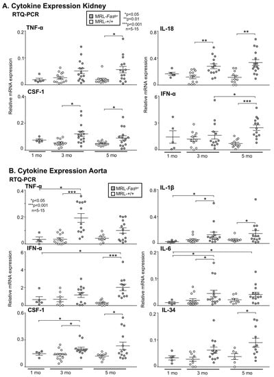 Upregulation of inflammatory cytokines in kidney and aorta with age and in MRL-Faslpr compared to MRL-++ mice. (A) Expression of TNF-α, IL-18, CSF-1, and IFN-α in the kidney of MRL-Faslpr mice compared to MRL-++ mice at 1, 3, and 5 mo of age. (B) Expression of IL-6, TNF-α, IL-1β, CSF-1, IL-34 and IFN-α in the aorta of MRL-Faslpr mice compared to MRL-++ mice at 1, 3 and 5 mo of age, n = 5–15 (a single data point refers to a single animal). Values are means ± SEM. Statistical analysis using Mann–Whitney U Test.