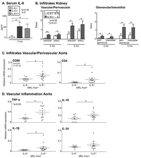 Deficiency of IL-6 results in amelioration of vascular inflammation determined in MRL-Faslpr mice. (A) Serum IL-6 expression evaluated by ELISA in the serum of Il6−/−, Il6+/− and Il6+/+ MRL-Faslpr mice (n = 5 per group). (B) Evaluation of intra-renal vascular/perivascular of arterioles and arteries, periglomerular and interstitial in Il6−/− MRL-Faslpr mice (3 and 5 mo of age) compared MRL-Faslpr mice, n = 6–10 per group. (C) Infiltration of the vessel wall with CD68+ macrophages and CD4+ T cells determined by RTQ-PCR at 3 mo of age in IL-6−/− MRL-Faslpr mice compared to MRL-Faslpr mice. (D) Expression of TNF-α, IL-1β, IL-18, and IL-34 in the aorta of IL-6−/− MRL-Faslpr mice compared to MRL-Faslpr to mice at 3 mo of age, n = 10–15. A single data point refers to a single animal. Values are means ± SEM. Statistical analysis using Mann–Whitney U Test.