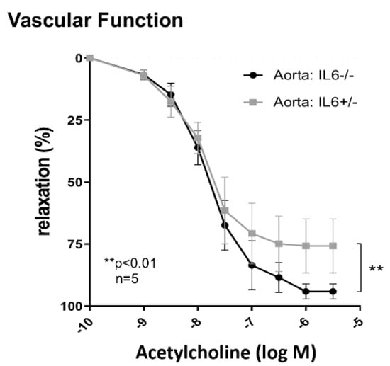 Effect of IL-6 on vascular function in mouse aorta. Thoracic aortic segments were isolated from 3-mo old male Il6+/− and Il6−/− mice. The rings were contracted with noradrenaline and then relaxed with increasing concentrations of acetylcholine, n = 5. Values are means ± SEM. Statistical analysis was performed using two-way ANOVA.