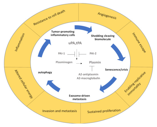 Here, we summarized recent studies showing the involvement of fibrinolytic factors, such as uPA, tPA, PAI-1, and PAI-2, and associated receptors, such as uPAR and LRP1, in modulating critical signaling pathways, and thereby contributing to the hallmarks of cancer. After their initial discovery as enzymes involved in clot dissolution, fibrinolytic factors and their ever-increasing coterie of known binding partners, including cellular receptors, enables them to contribute to every hallmark of cancer. We reviewed data on how they can (1) resist cell death through anoikis, (2) drive angiogenesis through M2 macrophage programming, (3) enable replicative immortality through the suppression of autophagy, (4) activate invasion and metastasis through exosomes, (5) evade growth suppressors, and (6) sustain proliferative signals/growth [5]. Their presence is required to establish a proper premetastatic niche.