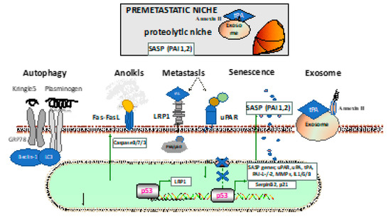 Fibrinolytic factors also find their way into exosomes, which are secreted vesicles that harbor biomolecules, such as RNA, DNA, and glycans surrounded by a lipid bilayer (recently reviewed by [6]), and are known to enhance metastasis by establishing a prometastatic niche. From anoikis to senescence to autophagy and exosome-mediated metastasis promotion, along with other hallmarks of cancer [5], fibrinolytic factors modulate cancer progression. Below we review some recent studies in these exciting fields.