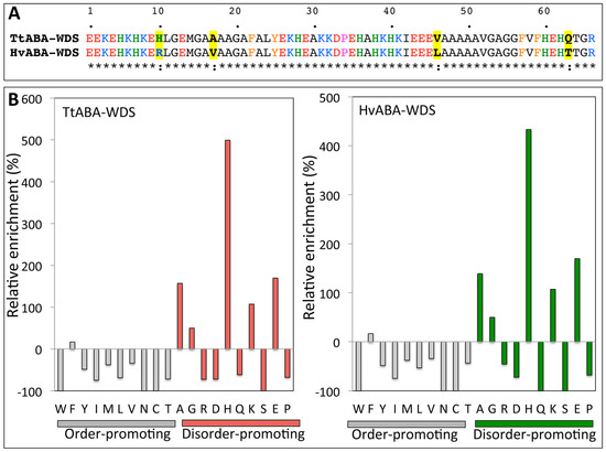(A) Amino acid sequence alignment of TtABA-WDS and HvABA-WDS. Basic residues are in blue, acidic residues in red, prolines in pink, histidines in green and aromatic residues in orange. Amino acid substitutions are shown in bold on a yellow background. The alignment was generated with Clustal Omega and then edited manually. (B) Deviation in amino acid composition from the Swiss-PROT database of TtABA-WDS and HvABA-WDS. The relative enrichment in disorder promoting (pink and green bars) and depletion in order-promoting (grey bars) residues is shown. Residues have been ordered on the x-axis according to the TOP-IDP flexibility index as described in [28].