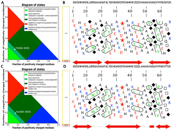 Phase diagram plots of TtABA-WDS (A) and HvABA-WDS (C) domains as provided by CIDER (http://pappulab.wustl.edu/CIDER/ (accessed on 25 January 2021)). MeDor [34] ouputs of TtABA-WDS (B) and HvABA-WDS (D) featuring the amino acid sequence above the HCA plot. The regions predicted as disordered by IUPRED [35] are represented by bi-directional red arrows.
