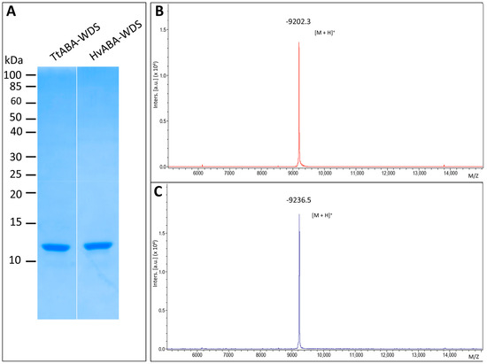 Purification of TtABA-WDS and HvABA-WDS domains from E. coli. (A) Coomassie blue staining of an 18% SDS-PAGE analysis showing the purified products as obtained after SEC. (B,C) MALDI-TOF-TOF mass analysis of intact TtABA-WDS (B) and HvABA-WDS (C) proteins. (B) Intact TtABA-WDS generated an average mass of 9201.30 Da for a theoretical mass of 9200.12 Da. (C) Intact HvABA-WDS generated an average mass of 9235.50 Da for a theoretical mass of 9234.22 Da. Masses were obtained with respectively 128 ppm (B) and 140 ppm (C) errors compatibles with the resolution of the spectrometer.