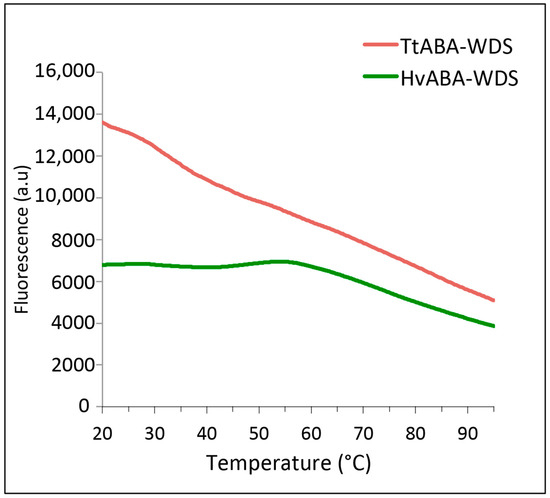 TtABA-WDS and HvABA-WDS were further analyzed by differential scanning fluorimetry (DSF), a technique used to determine the conformational stability of proteins that relies on the use of a fluorescent dye whose fluorescence is enhanced when protein hydrophobic cavities become accessible as a result of temperature-induced protein unfolding. IDPs, which do not possess hydrophobic cavities being devoid of a stable 3D structure, are characterized by a fluorescence profile that is rather flat and temperature-independent [17]. The experimentally observed profile obtained for HvABA-WDS is flat, consistent with the lack of a stable 3D structure (Figure 4). Albeit the profile of TtABA-WDS is not flat and rather features a progressive decrease in the fluorescence with increasing temperature, it still lacks the typical transition peak observed for a folded protein undergoing a cooperative transition (Figure 4). As such, the observed profile is indicative of the lack of 3D structure like in the case of HvABA-WDS. Therefore these results strengthen the conclusion that TtABA-WDS and HvABA-WDS are intrinsically disordered domains (IDDs), in line with in silico analyses and with the above-described experimental lines of evidence.