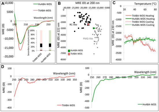 To provide more evidence on the conformational state of TtABA-WDS and HvABA-WDS domains, we analyzed the environment of the aromatic amino acid side chains, which provides information about the tertiary structure, by measuring the CD spectra in the near-UV region (250–350 nm) at 20 °C [42]. Although the near-UV CD spectra of TtABA-WDS and HvABA-WDS are not superimposable, they are both characterized by a weak intensity and by the presence of a broad negative band (Figure 5D), once again consistent with the lack of a stable tertiary structure and of a hydrophobic core containing oriented aromatic residues as typically found in globular proteins [43]. The differences observed between the two near-UV CD spectra likely reflect differences between the two domains that are also pinpointed by far-UV CD studies.