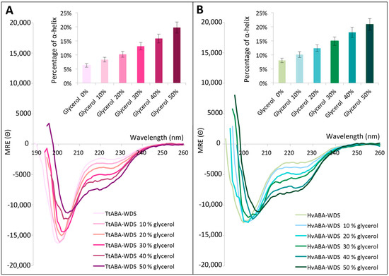 Far-UV CD spectra of HvABA-WDS (A) and TtABA-WDS (B) in the presence of increasing concentrations of glycerol at 20 °C. Domains were at 0.12 mg/mL in 10 mM sodium phosphate pH 7. Data are shown to the point up to which the dyna voltage was in the permissible range. Data are representative of one out of two independent acquisitions. The insets show the α-helical content as derived as described in Materials and Methods (see Equation (6)). MRE: molar residue ellipticity (Θ) in deg cm2 dmol−1.
