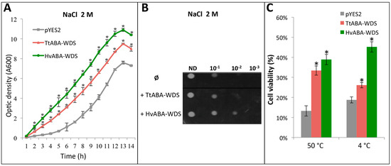 After transformation, growth assays of yeast cells on solid and liquid media in the presence of galactose and salt (2M NaCl) were conducted. Under salt stress the recombinant yeast strains expressing HvABA-WDS and TtABA-WDS domains grow better than the control strain bearing an empty vector, with HvABA-WDS conferring a higher resistance to salt stress compared to TtABA-WDS in both liquid and solid media (Figure 8A,B).