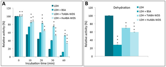 2.9. HvABA-WDS and TtABA-WDS Domains Stabilize the Enzyme LDH against Thermal and Dessication Stress